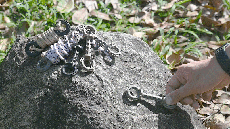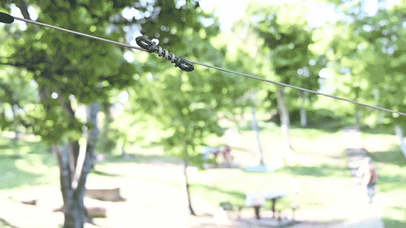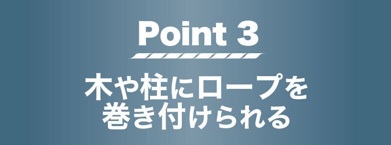 木や柱があれば瞬時にロープを結べるのも『Tighten It!』の魅力のひとつ。独自構造でしっかりとロープを止めることが出来るので、難しい結び方を覚える必要もありません。