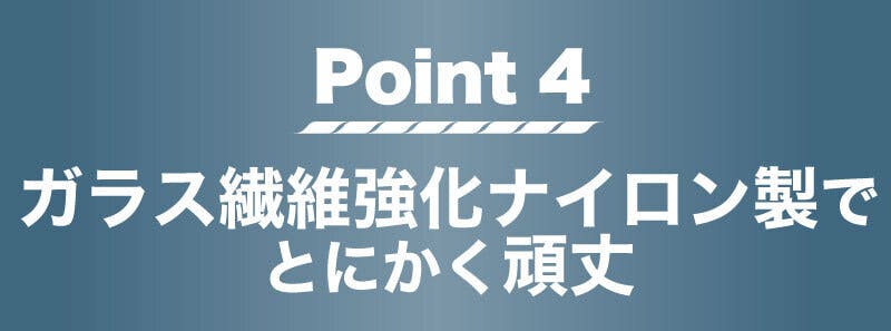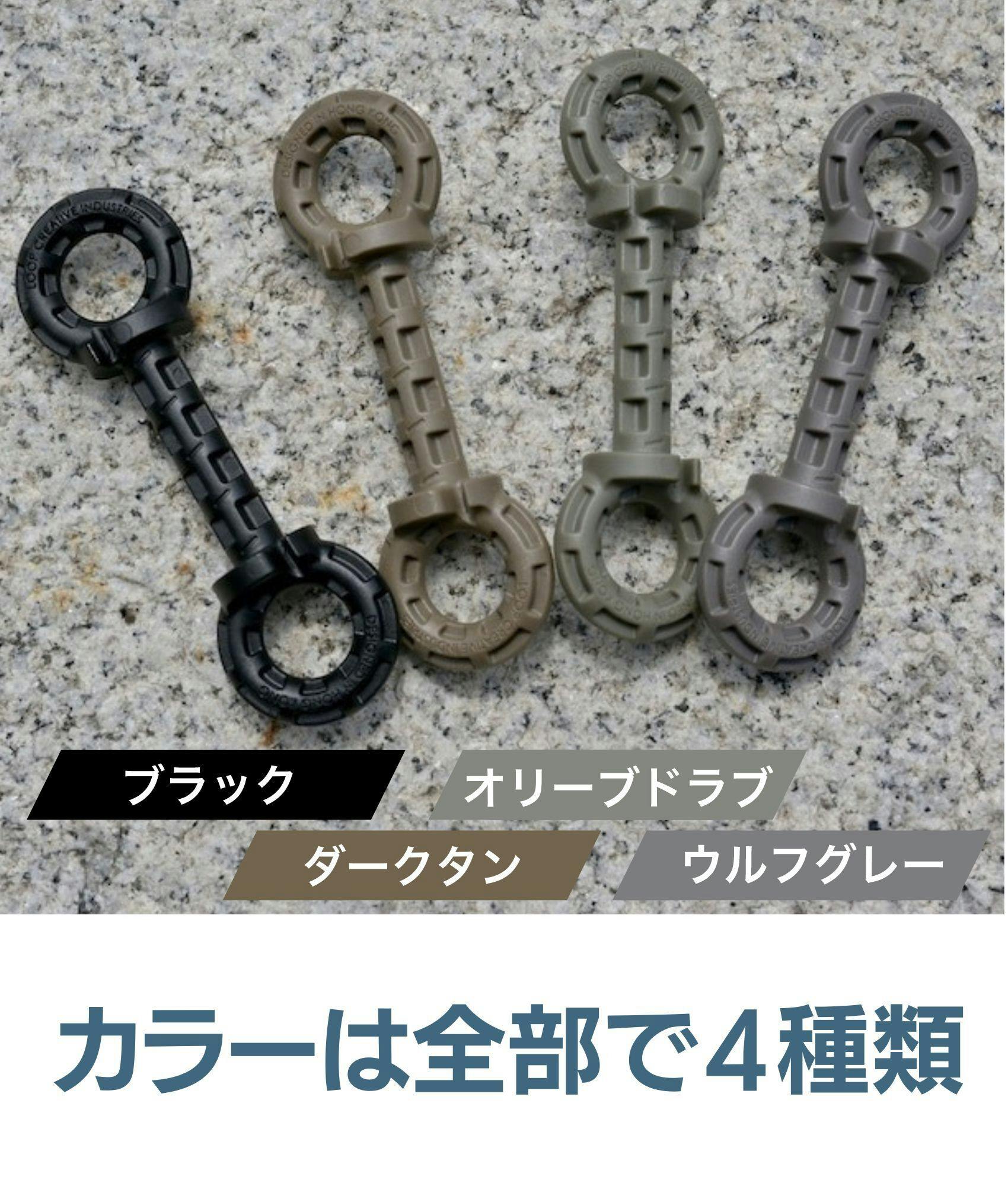 Tighten It!の素材には軽くて丈夫な「ガラス繊維強化ナイロン66」を使用。ガラス繊維の中でも剛性に優れた”ナイロン66″は、落下などの衝撃に強いだけでなく、高温や長く荷重がかかる環境でも変形しにくいミリタリーグレード素材です。