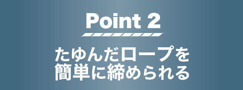 『Tighten It!』は本体にロープを巻くことで緩んだロープを強く縛ることもできます。4mmのロープなら約14.5cm短縮。ロープのたわみもたった10秒で解決です。