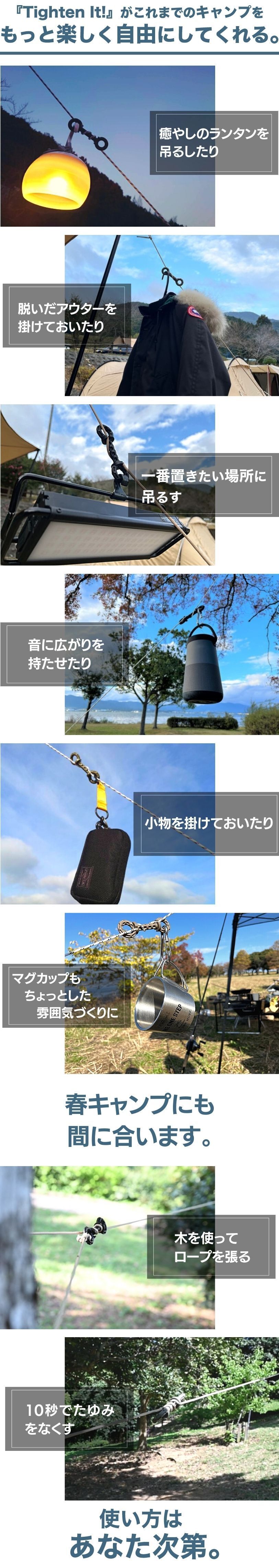 今回の『Tighten It!』はとてもシンプルな構造ながら、驚くほど簡単にさまざまなものを吊るすことができます。ロープを張ったり巻き付けるのはもちろん、お気に入りのランタンもスピーカーも、洗った食器もTシャツだってなんだって吊るせます。ちょっとしたアイデアがキャンプをより楽しく華やかにしてくれる、そんなキャンプギアです。