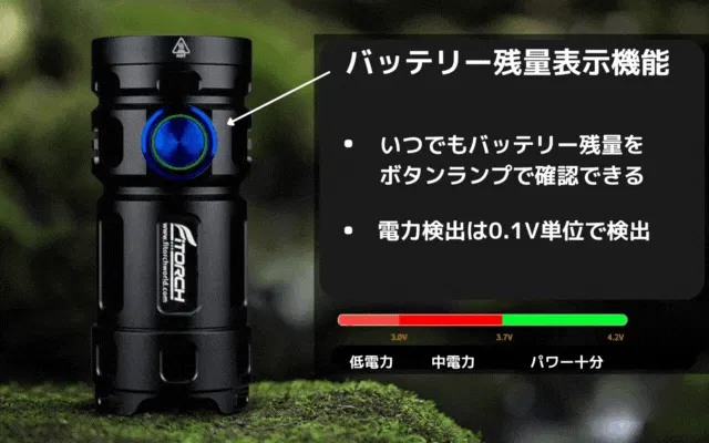 ・電源OFF時にボタンを3回連続でクリックすると電源検出機能が作動、ボタン周りのランプが点滅して電圧を表示。緑色のランプが1.0Vを示し、赤色のランプが0.1Vを示します。※例えばバッテリー残量が3.8Vの場合は緑ランプが3回、赤ランプが8回点滅します。