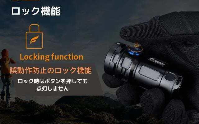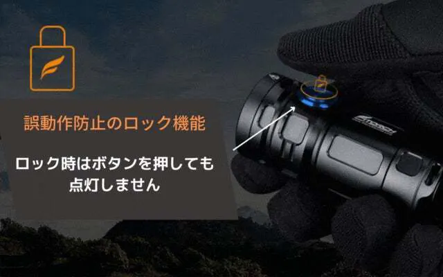 ロック機能を使えばポケットやバックの中に入れて持ち運ぶ時の誤動作や、小さいお子様が触っても点灯しないので大丈夫です。