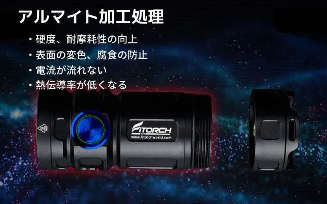 通常のプラスティック製の懐中電灯は落としたらすぐ壊れたり割れたりします。しかし「P25GT」のボディーは飛行機や宇宙船に使用される高強度な航空宇宙アルミニウム合金で出来ており、さらに表面にアルマイト加工処理を行っているため地面に落としても壊れない耐衝撃性を持っています。