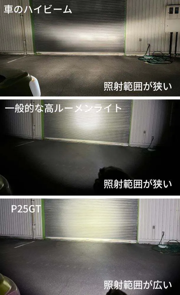 P25GTは一般的な高ルーメンライトと違い、照射範囲が広いため近くから遠くまで広角に明るく照らすことが出来ます。