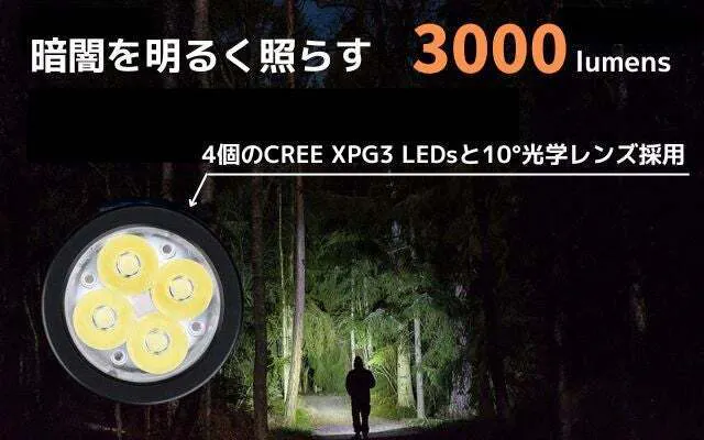 他に類を見ない高性能LED懐中電灯、3000ルーメンの眩しいほどの明るさで高性能で頑丈でコンパクト、またカッコいいデザインで一目見て気に入りました。