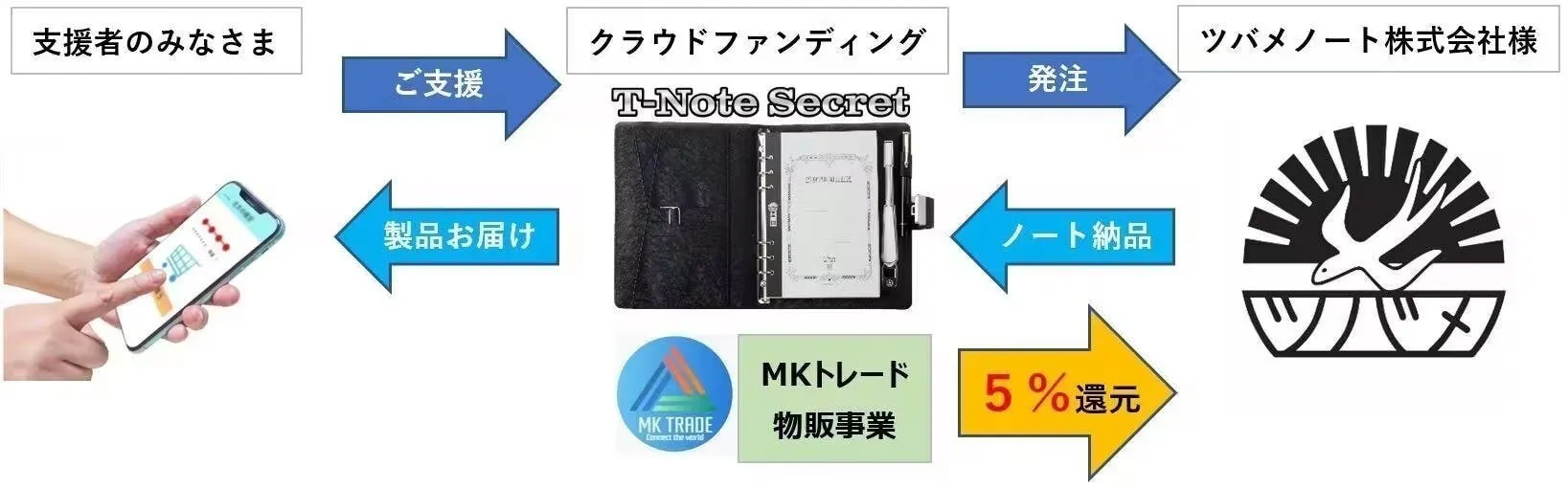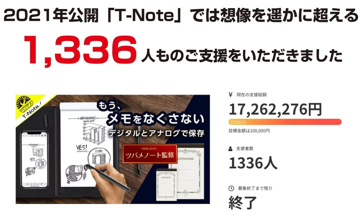 2023/12/09 12:00お世話になっております。MKトレードです。本日、『T-Note2』を公開させていただきました!大変反響をいただいた初期モデル『T-Note』発表から2年が経ちました。充電ポートが待望のType-Cとなりました。今回もツバメノート社推奨デジダル文具として、ツバメモA5(方眼)が付属します。★新商品『T-Note2』https://camp-fire.jp/projects/view/719281『T-Note2』は、メモ帳やノートに書くようにパソコンやスマホに書き写すことができます。①手書きメモをリアルタイムで「デジタル化」②パソコン上に「手書き」で同時表示出来、オンライン会議にも使用できる!③専用スマホアプリで同時描写もできる!④「ツバメノート」の『ツバメモA5』を付属!書きやすいフールス紙⑤「スタイラスペン先」を使って紙を節約!お得なリターンは「数量限定」となります。この商品をもっと多くに方々に知っていただきたいと思っておりますので、SNSなどでのシェアなど大歓迎です!ぜひお見逃しなく、ご検討をどうぞ宜しくお願いいたします!---------------------------------------------------■リピーター様向けキャンペーン■今回のプロジェクト『T-Note2』をご支援いただいたリピーター様に対して「先着50名様 オリジナルポケットメモ帳プレゼント」いたします!★応募方法★今回のプロジェクト『T-Note2』をご支援のうえ、「メッセージを送る」より下記を記載してご応募ください。・過去にご支援くださった弊社プロジェクトの商品名・過去支援ID・氏名---------------------------------------------------最後まで、どうぞよろしくお願いいたします。https://camp-fire.jp/projects/view/719281『T-Note2』プロジェクトスタッフ一同************************************************************★同時開催中プロジェクト『DigiNotePro3』画期的な電子タブレットhttps://camp-fire.jp/projects/view/717657++++++++++++++++++++++++++++++++『LetSketch』300dpi小型サーマルプリンターhttps://camp-fire.jp/projects/view/681331追加購入などに便利な「MKTrade限定公開ショップ」もぜひご覧ください♪https://mktrade2.official.ec/ もっと見る