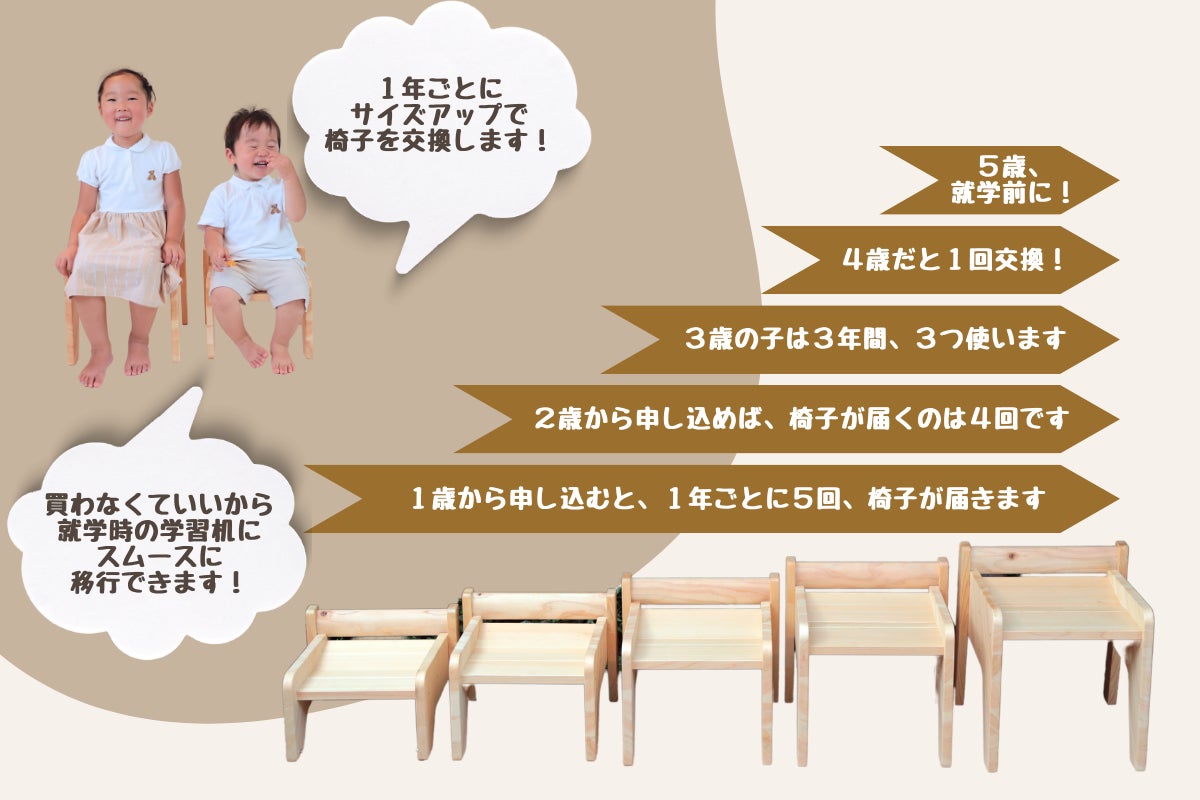 乳幼児期から学童期に使う椅子と机は子どもたちの心と身体つくりに、とても大切なアイテムと考えます。しかしながら、どんどんと成長するので、そのたびにとり替えることは難しい。そこで、子どもの成長に合わせた椅子を使うことのできるプロジェクトは、何よりも子どもたちへのプレゼントになること間違いなしです。