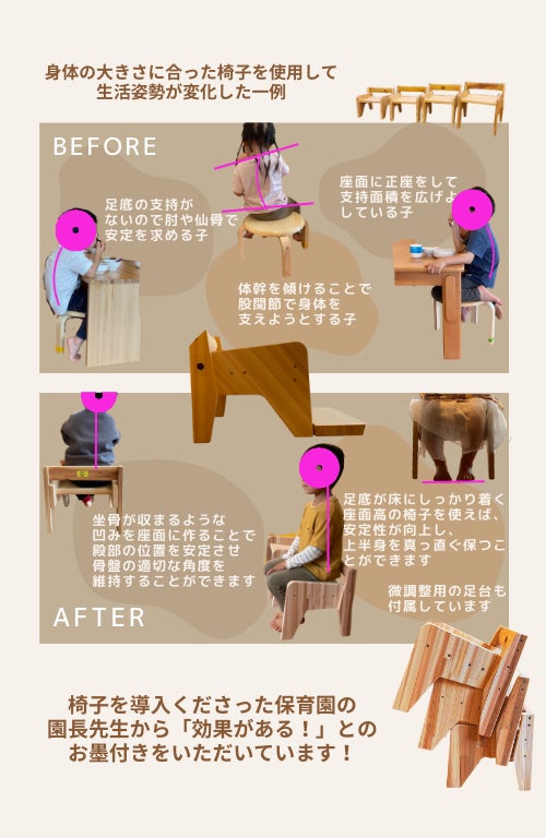 実は今回の椅子作成は、そもそも保育園の園長先生からいただいた「子どもが姿勢良く座れる椅子を作ってもらえないか」というご相談が発端ではじまりました。