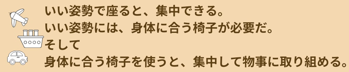 子どもたちは、自分の身体に合った椅子と机を使うことで、自ら安定した姿勢を保つ力を育てることができます。そして、安定した姿勢で座ることができれば、その椅子に座っていることが苦ではなくなります。