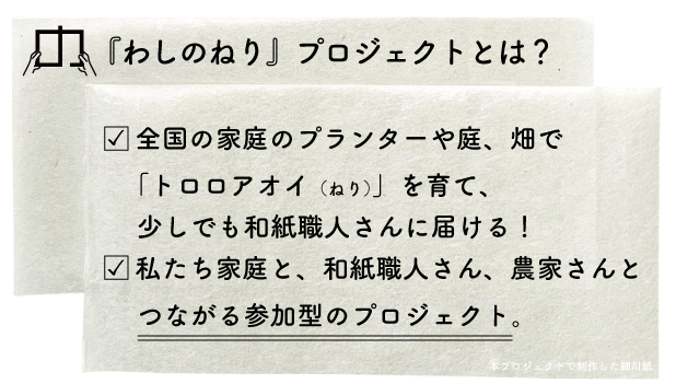 今回の「わしのねり」は3年目となり、農家さん、紙漉き職人さん、消費者がつながる伝統工芸のこれからのモデルとなり、自然をとりこむ同化感覚を持つ日本だからできる持続可能な社会に向けて、新しい循環の仕組みづくりに向けて確実に歩んでいると実感しています。 ぜひ、一緒に楽しんで「ねり(トロロアオイ)」を育ててみませんか。和紙に触れてみませんか。