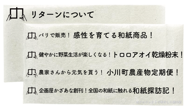 育てていただいた方に和紙を使っていただきたく、返礼品として育てたトロロアオイで漉いたユネスコ登録の細川紙一筆箋や食品などをお送りさせていただくとともに、A・Bランクに入った方には、細川紙での感謝状をお送りさせていただいています。