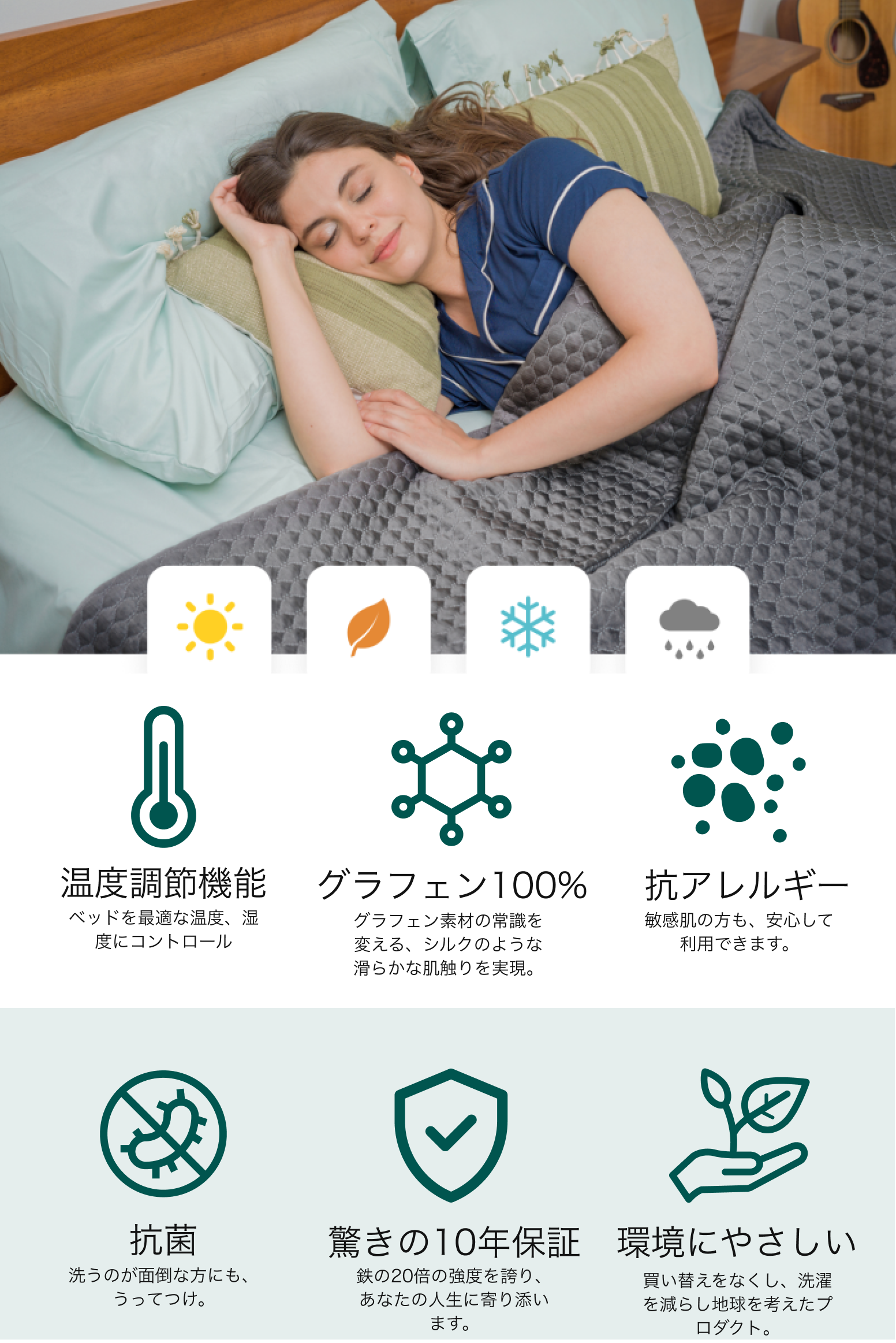 ノーベル賞を受賞した新素材グラフェン100%の素材を含んでできており、ブランケットの概念を超える脅威の熱伝導性と湿気を分散させることが可能。