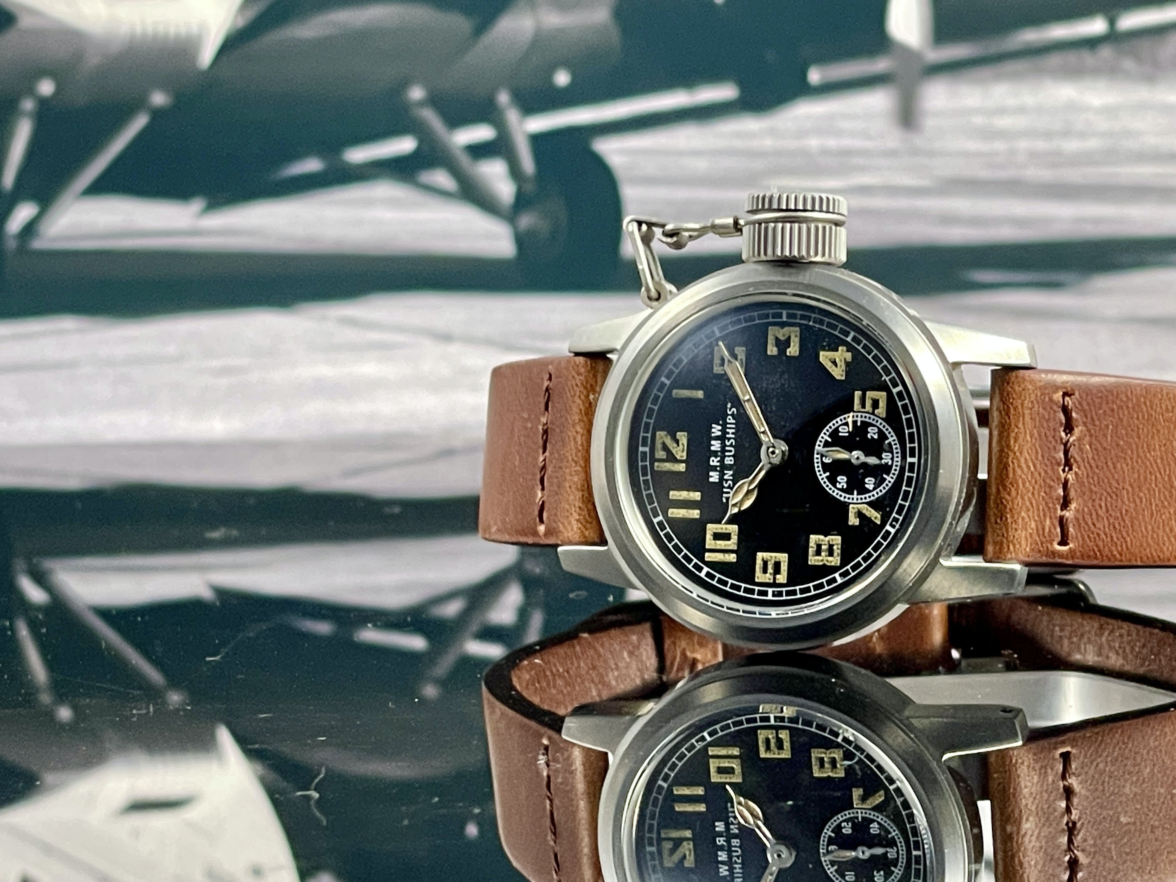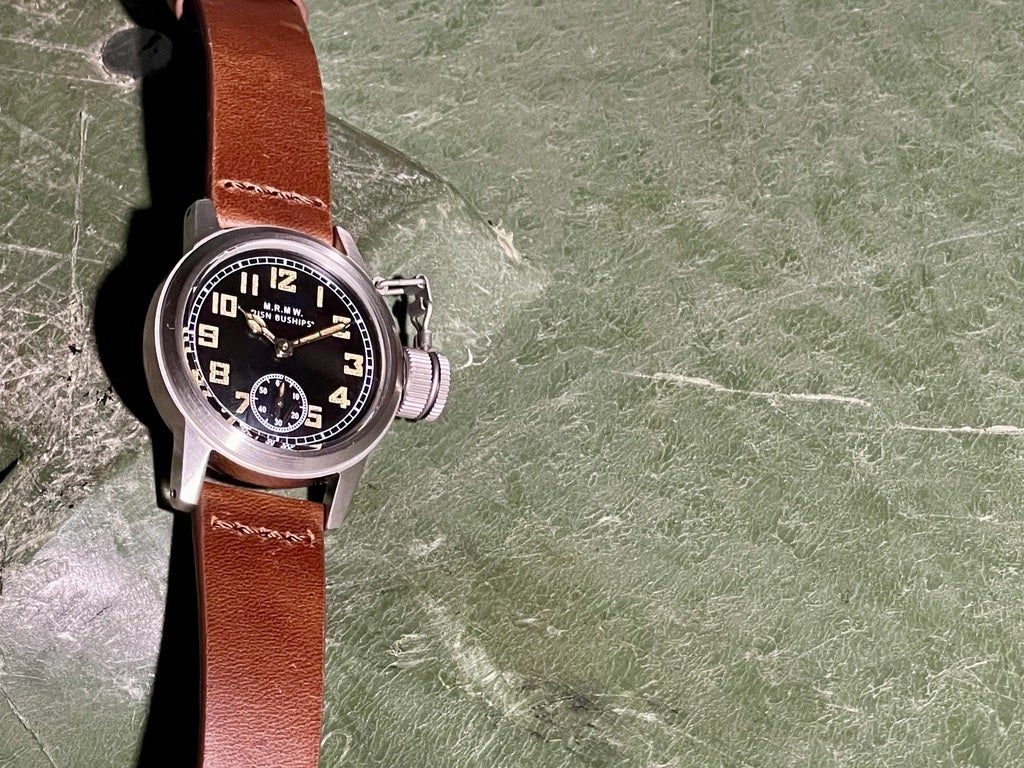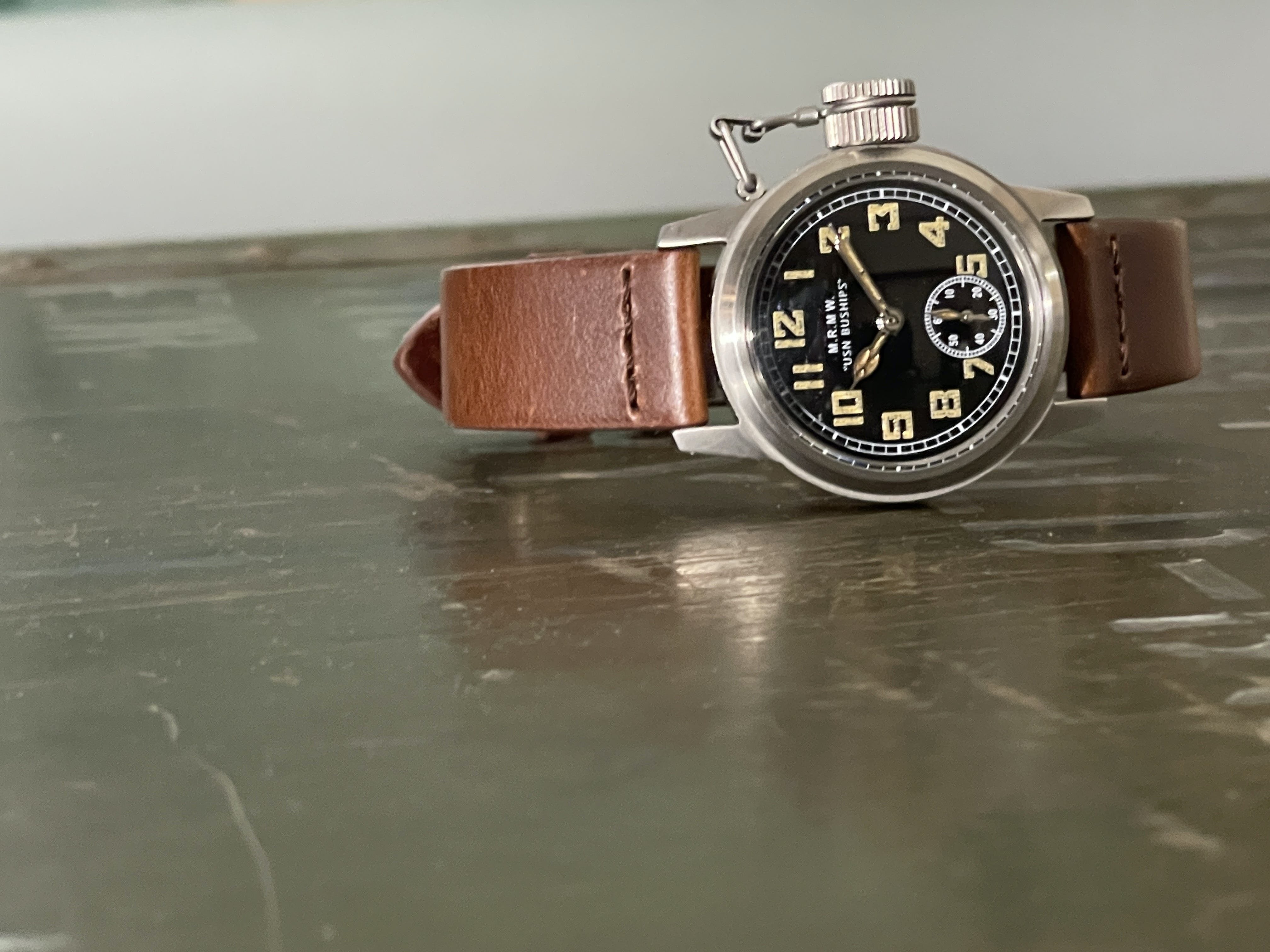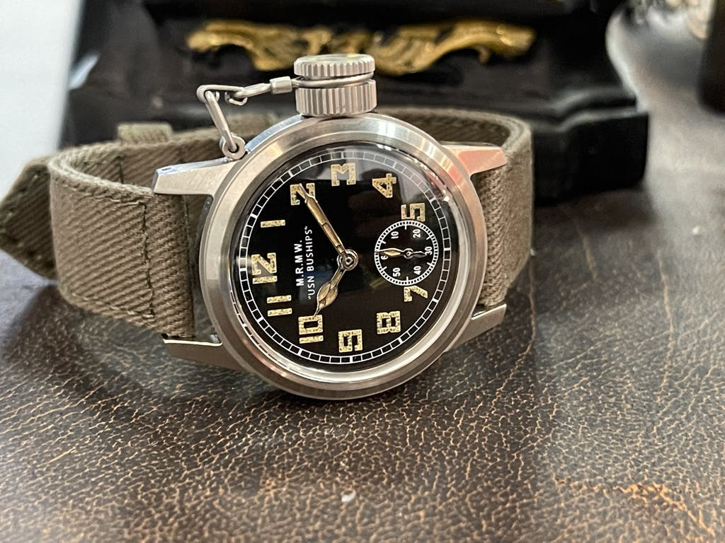 12時位置には"M.R.M.W"と"USN BUSHIPS"のロゴ。"USN BUSHIPS"とはUnited State Navy Bureau of Shipsの略でいくつか種類のあるオリジナルの文字盤にも同様に記載されているものがあります。6時位置には秒を知らせるスモールセコンドを配しています。