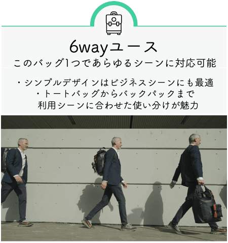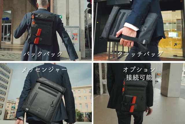 ビジネスに最適なトートバッグから、アウトドアで活躍可能なバックパックまでその場で変身可能。