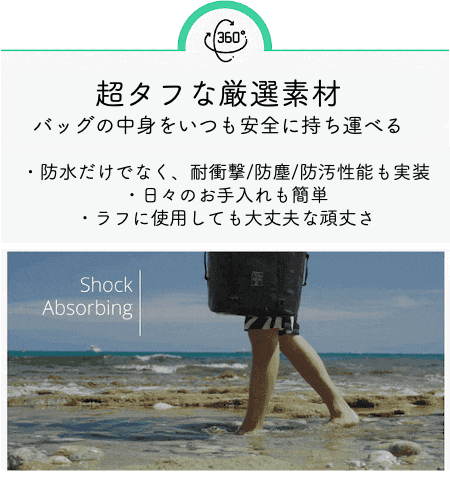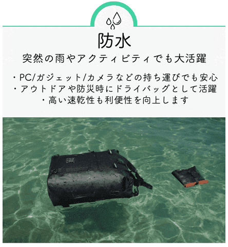 ※止水ジップと、縫い目の無い溶接接合で高い防水性を実現致しましたが、ご使用方法によってはファスナーの隙間から水が侵入することがございます。電子機器などを収納しご使用される際は、海などに沈めないようご注意ください。