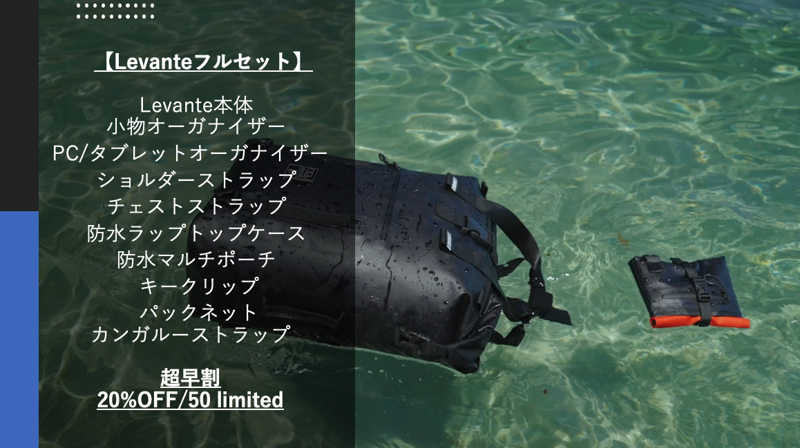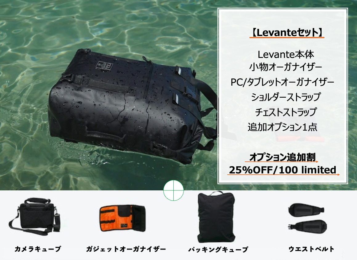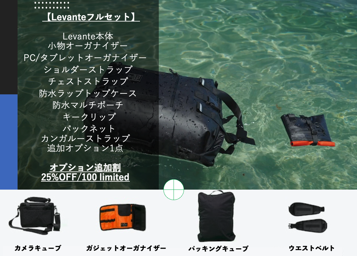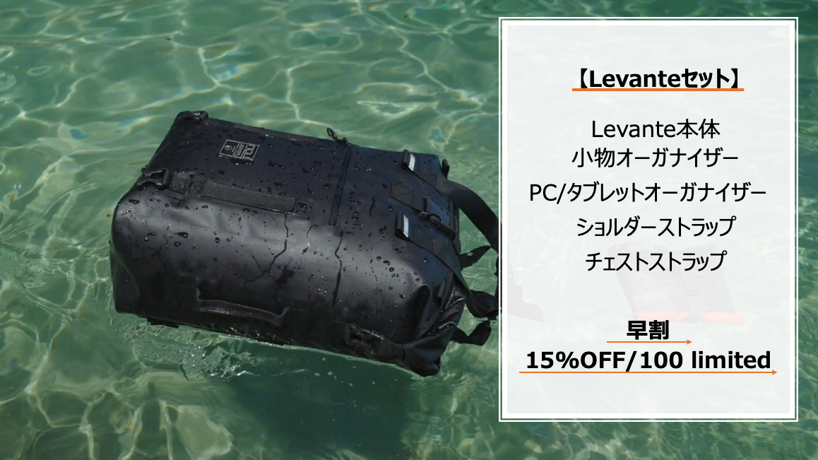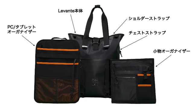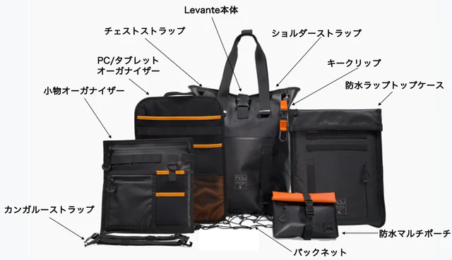 Levante本体/小物オーガナイザー/PC・タブレットオーガナイザー/ショルダーストラップ/チェストストラップ/防水ラップトップケース/防水マルチポーチ/キークリップ/パックネット/カンガルーストラップ