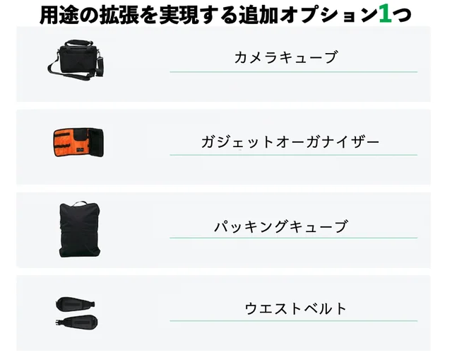 バッグ本体に接続可能なオプションを活用することで、用途の拡張性は無限大になります。