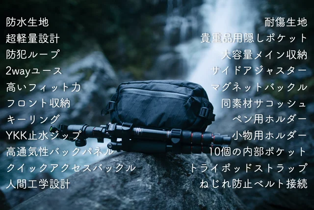 スリングバッグとウエストポーチの2way仕様をはじめ、徹底した素材選びと内部の作り込みにより、カメラ・ガジェット用バッグの決定版とも言える製品が誕生いたしました。