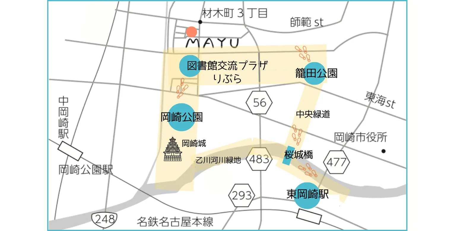 岡崎市は国土交通省から「新しいまちづくりのモデル都市」に選定されており、ウォーカブルシティの構築を掲げており、歩いてまちを楽しむことのできる施策を進めています。MAYUは、岡崎城や美しい自然が広がる岡崎公園から徒歩5分。この区域の中央図書館や絵本専門店があり、歴史的風情のある文化的なエリアに立地しています。