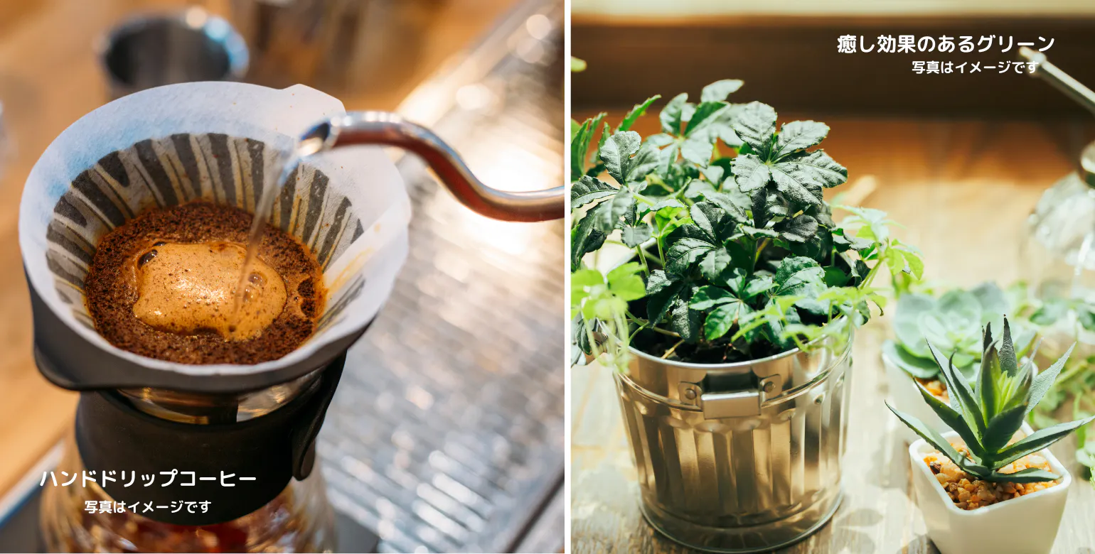 観葉植物などのみどりに囲まれ、ドリンクを片手に読書や考えごとができる心地のよい空間です。