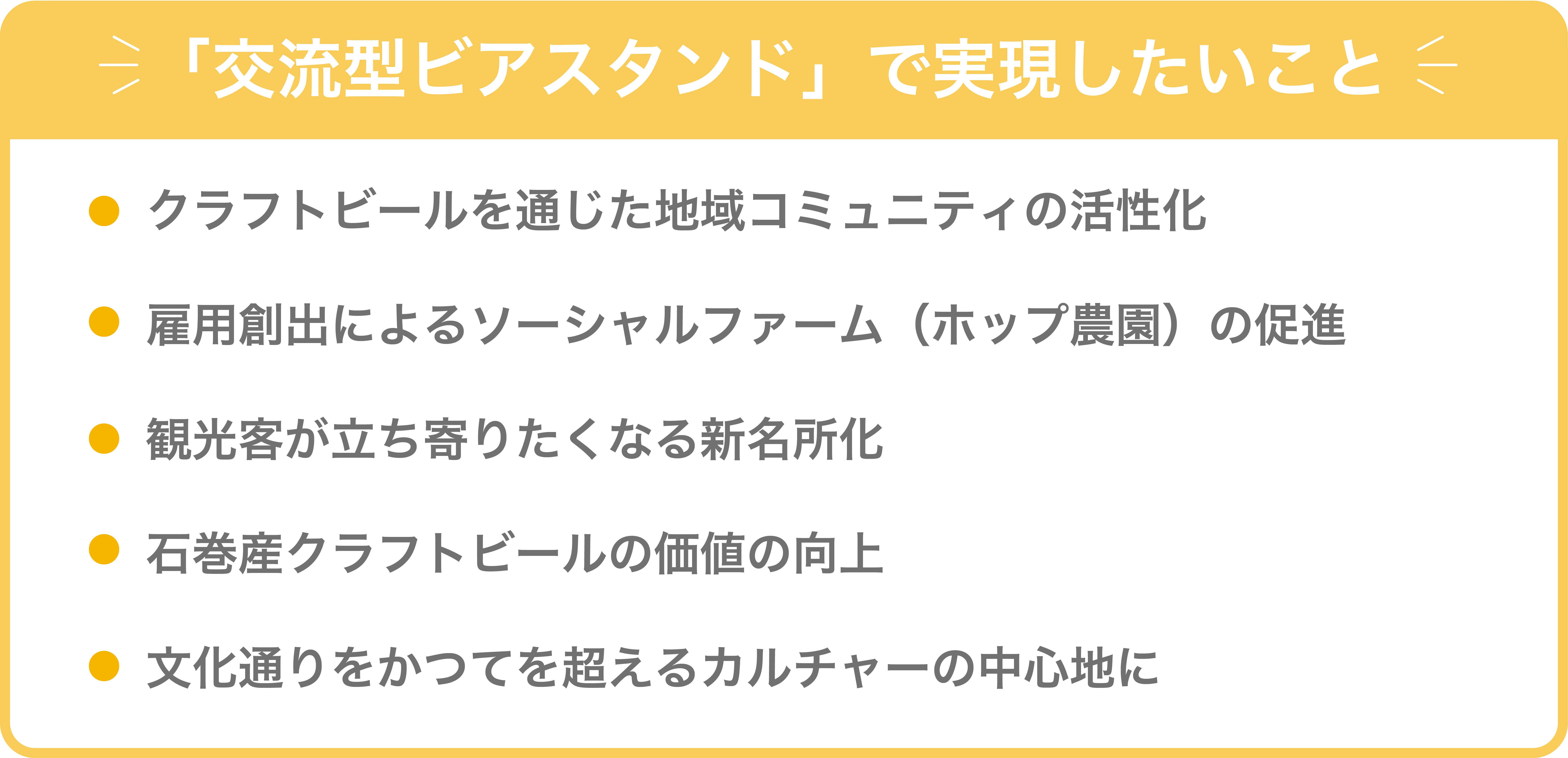 また、新たな観光名所としての役割も担い、石巻に興味を持って足を運んでくれた方が立ち寄りたくなるような場所となることで、「石巻と言えばクラフトビール」という新たな観光の入り口にもなるはずです。