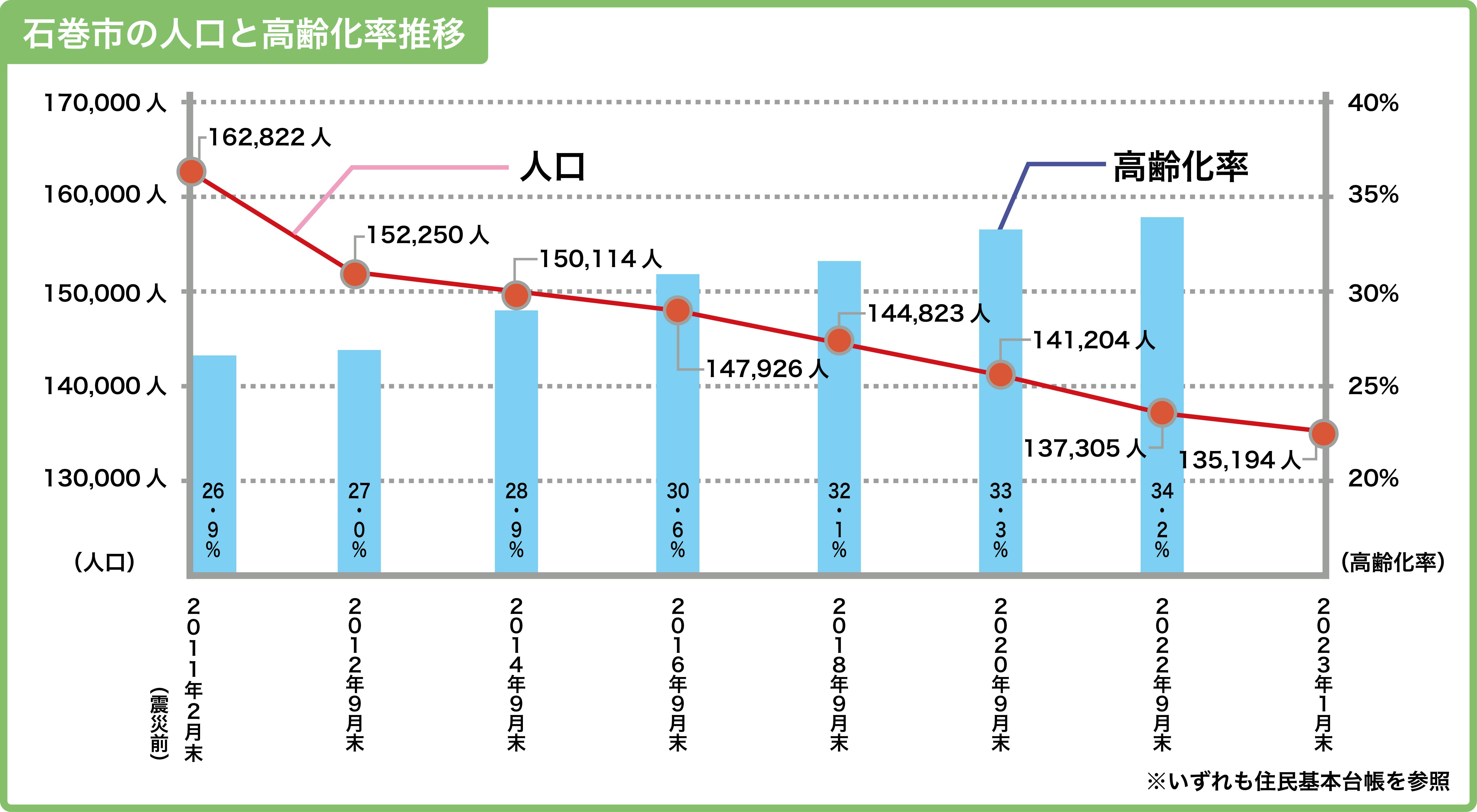 特に震災後は人口減少が顕著で、震災前の平成23年2月末に162,822人だった人口は、この12年間で135,193人(2023年1月末現在)と、約28,000人も減少しています。また、このうち65歳以上の人口が46,999人(2022年9月末現在)で高齢化率は34%を超えており、その対策として、交流人口の増加や移住・定住の促進への施策が盛んに展開されています。