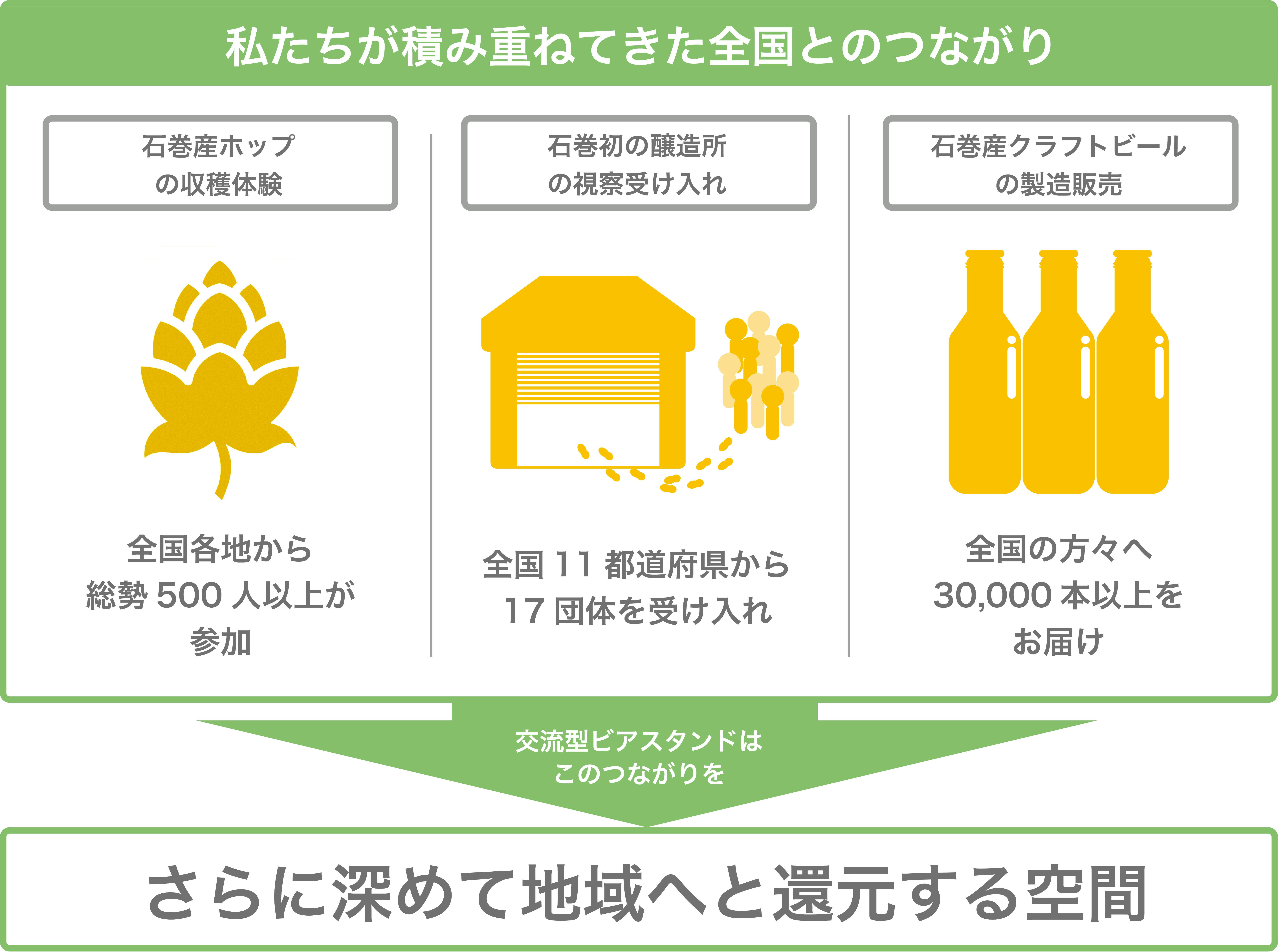 またさらに、「交流型ビアスタンド」は雇用創出の場だけではなく、「気軽に出来立てのクラフトビールを飲める場所があれば、もっと石巻に行きたくなるのに」という声があるように、ホップ栽培やビールの製造販売を通してつながってきた全国のファンの皆さんが石巻を訪れる大きなきっかけにもなり得るはずです。