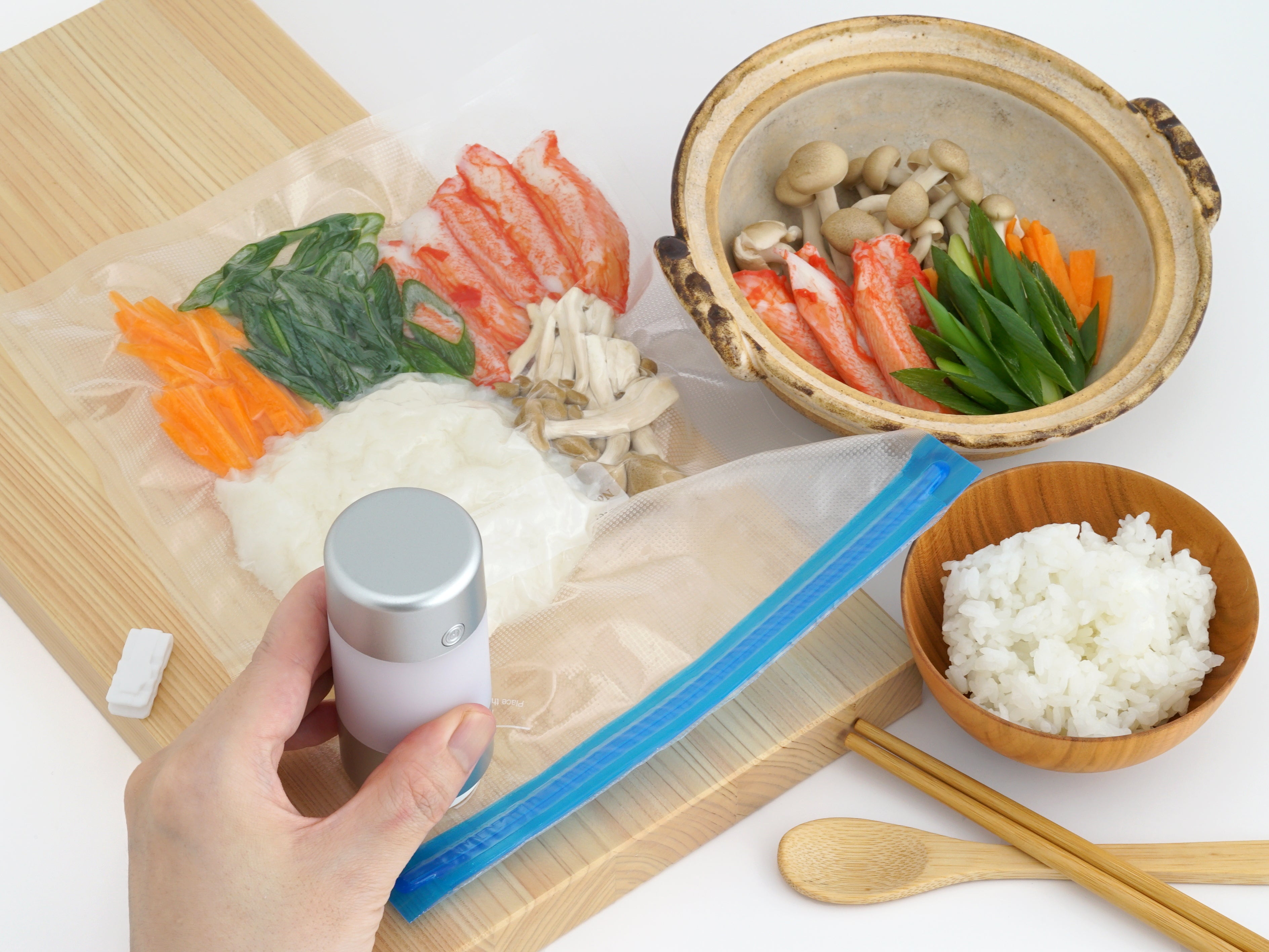 また、専用バッグは食品を使いながら繰り返し真空にできるので便利です。一度には使いきれないけど普段よく使う食品(生ニンニク、生姜、チーズ、ソーセージなど)を専用バッグに真空保存しておくと、使う分だけ取り出してすぐに再び真空パックにできるので鮮度を落とさず美味しく食べ続けることができます。