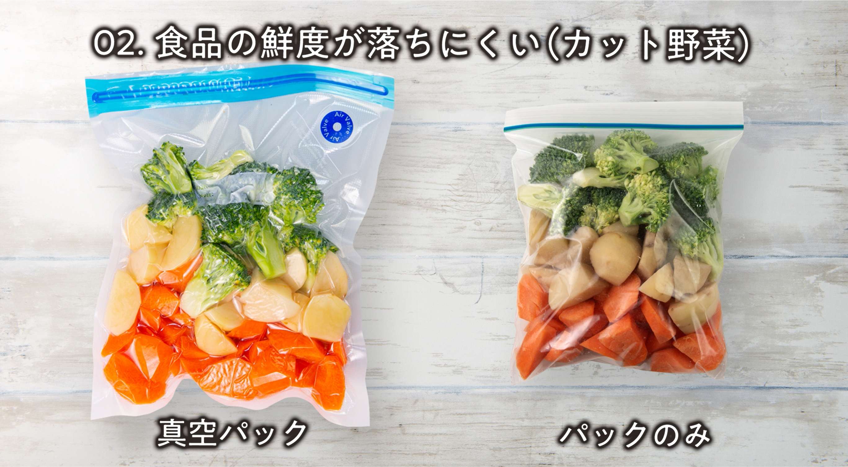 真空パックにすると空気との接触を防ぐことができるため、食品の乾燥や酸化を抑えることができます。鮮度を保つことで、見た目も、味(美味しさ)も、キープできます。