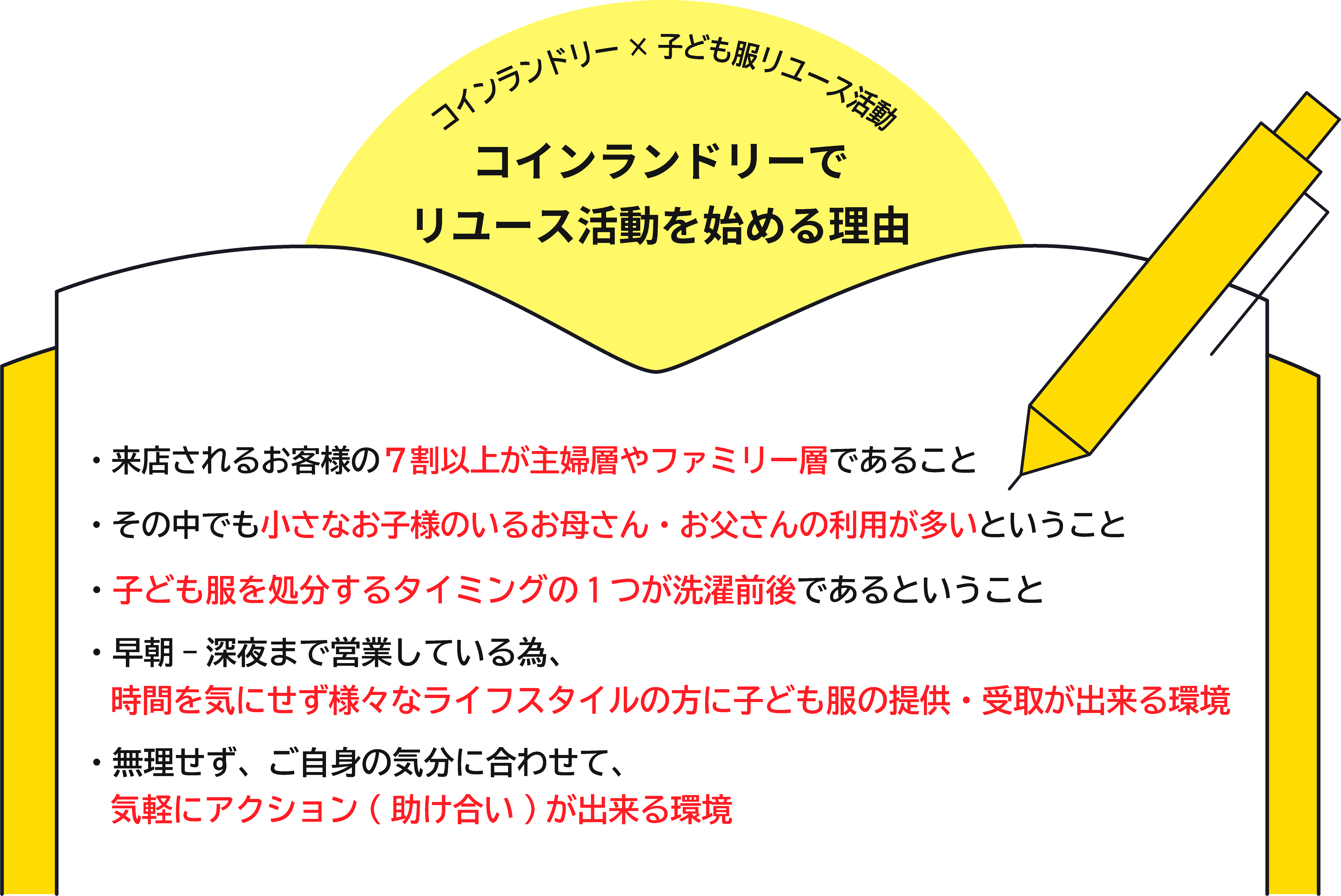 以下の理由から「コインランドリー」×「子ども服のリユース活動」をマッチングさせることでお母さん・お父さんのお役に立てると考えました。