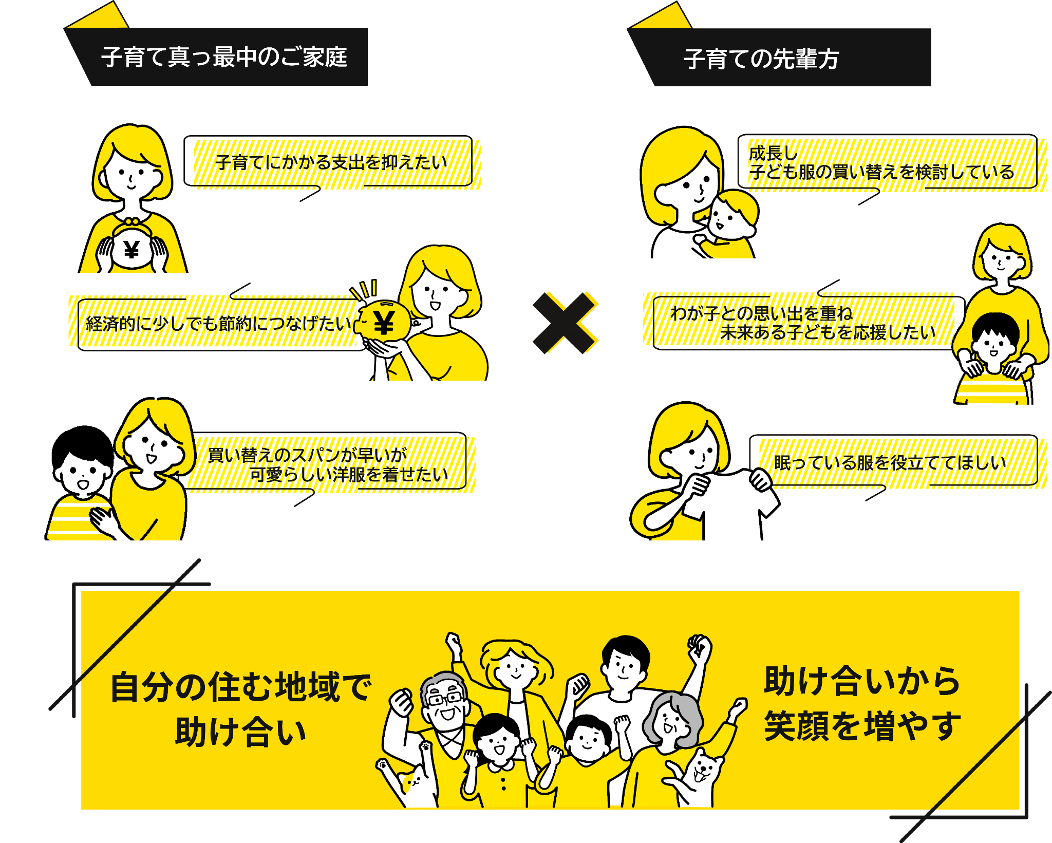 お知り合い同士は、悩みを分かち合い、助け合いがし易いですが、この取り組みは知らないお母さん・お父さん同士でも子ども服を通して、子育てに関する「地域の助け合い」「経済的な節約」「子育て世帯の支出を抑える」といった子育てに関するお悩みを解決できる取り組みです。