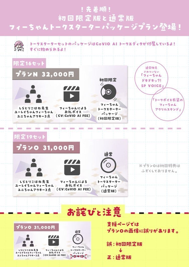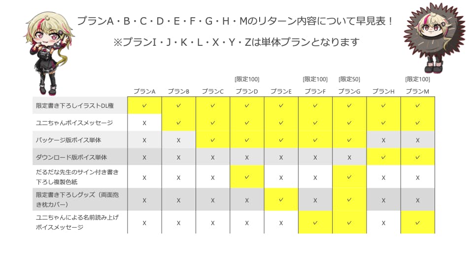 全てのリターンをご支援いただく場合はプランG・X・Y・I・J・K・Lの7種類をご選択いただくことになります。(※ダウンロード版ボイス単体とフルスクラッチ3Dモデルとフィーちゃんパッケージを除く)