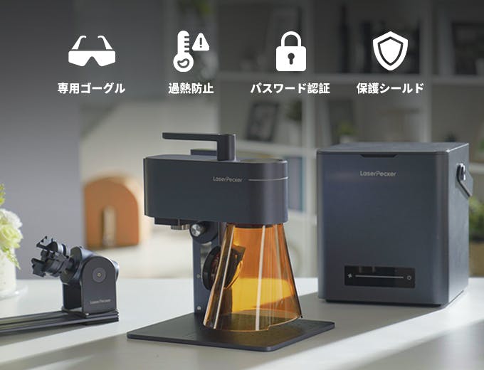 LaserPecker4を含む全てのLaserPecker製品の設計において、安全性は最優先事項です。彫刻中に急激な傾きや振動が発生した場合、また彫刻対象物の過熱を感知した場合、彫刻機は即座に動作を停止します。