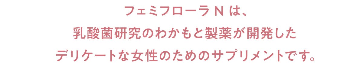 私たちを含め多くの女性がデリケートなお悩みを抱えています。その原因は、ちゃんと自分に適した ケアが出来ていないからかもしれません。 フェミフローラ Nは、そんなお悩みに適した善玉菌を手軽に摂取し、体内に長く滞在させることで 女性のデリケートなお悩みをサポートします。
