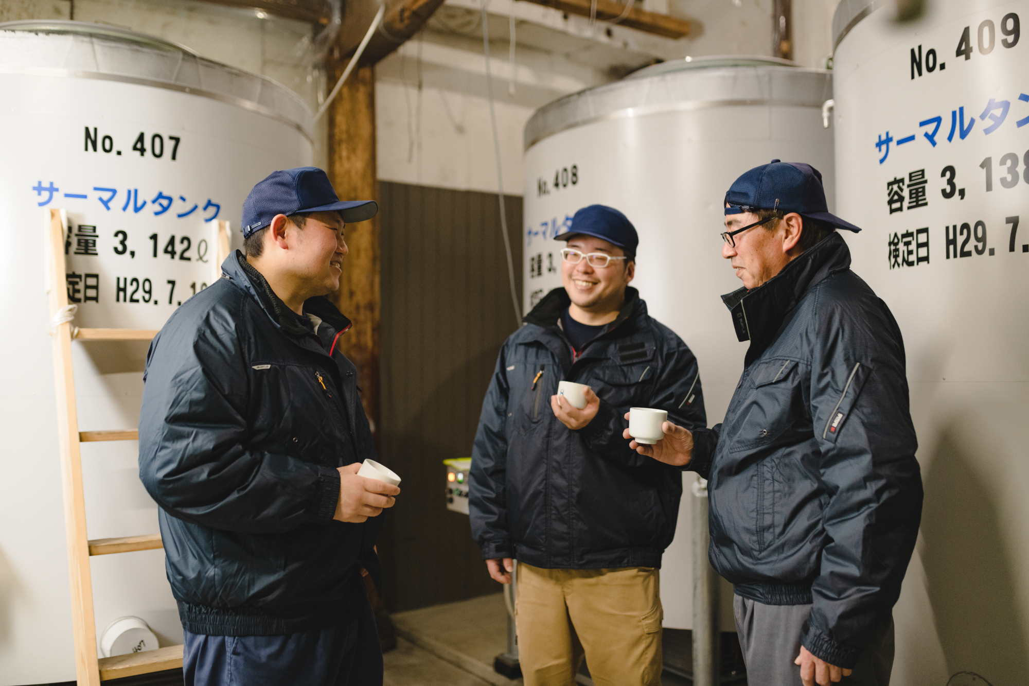 【出来上がった日本酒を手に語らう蔵人】