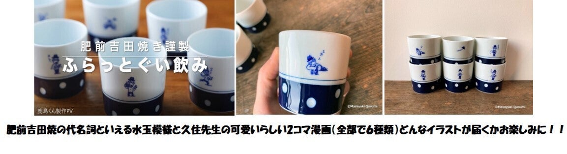 『ふらっとぐい飲みは、ボクがデザインした陶器ぐい飲みに、表裏で2コマのイラストをつけた物で6種類あります。