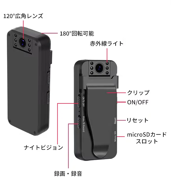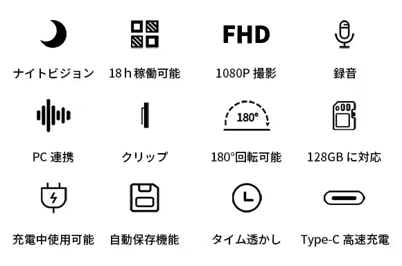 ・ホームセキュリティ:18時間稼働可能で長時間定点録画に活用できます。自宅の窓際やテーブル、ドアなどに置くだけで防犯カメラとしても大活躍。