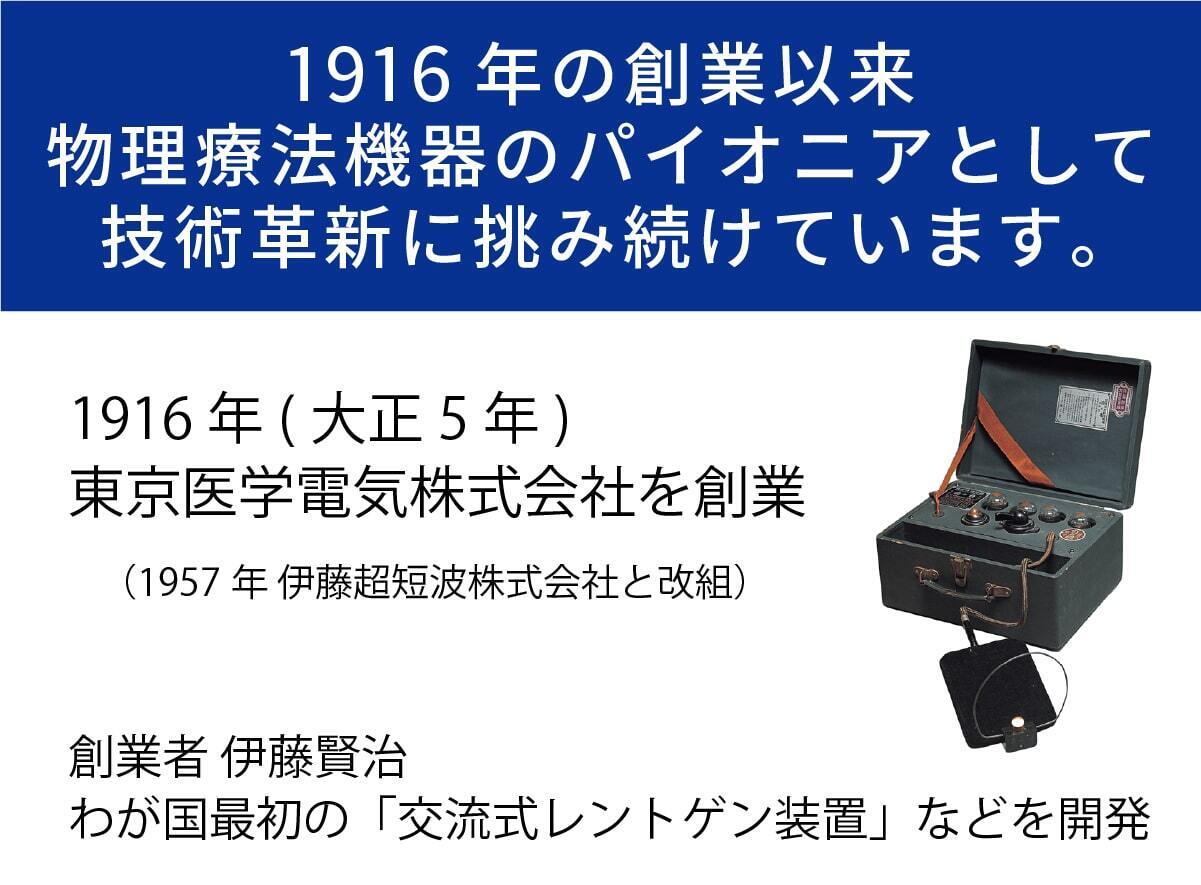 伊藤超短波は1916年に創業し、物理療法機器のパイオニアとして100年の歴史を歩んできました。創業者である伊藤賢治が物理療法を独自に研究し、日本初の超短波治療器を開発して以来、当社は数多くの物理療法機器を開発してきました。その過程で機器の性能や安全性にこだわってきたのはもちろん、どこよりも早くEBM(Evidence-based medicine: 根拠に基づく医療)の確立を目指してきました。今や医療機器メーカーにとってもEBMの裏付けは必要不可欠です。その高い信頼性と技術力とが融合され、伊藤超短波の治療器は医療やスポーツ分野における専門治療にも幅広く用いられています。また家庭用機器の分野でも一般の方々が安心して使える効果的な製品をご提供してきました。海外展開も積極的に行い、その成果が実って「ITO」ブランドは海外でも確実に知名度を上げています。