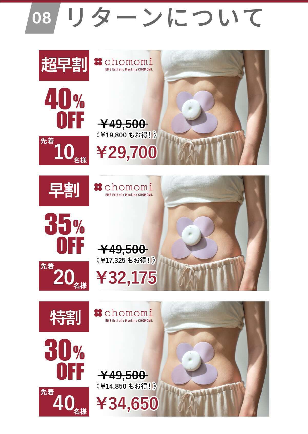chomomiは4つの電極シートを搭載することで、より腸に刺激することができます。また、一般的なEMSと比べ痛みのない技術的な工夫もしております。 最初は信じてもらえないかもしれません。でも数日後には…「今まで悩んでいたのが嘘みたい。」と感じてもらえる事を確信しています。