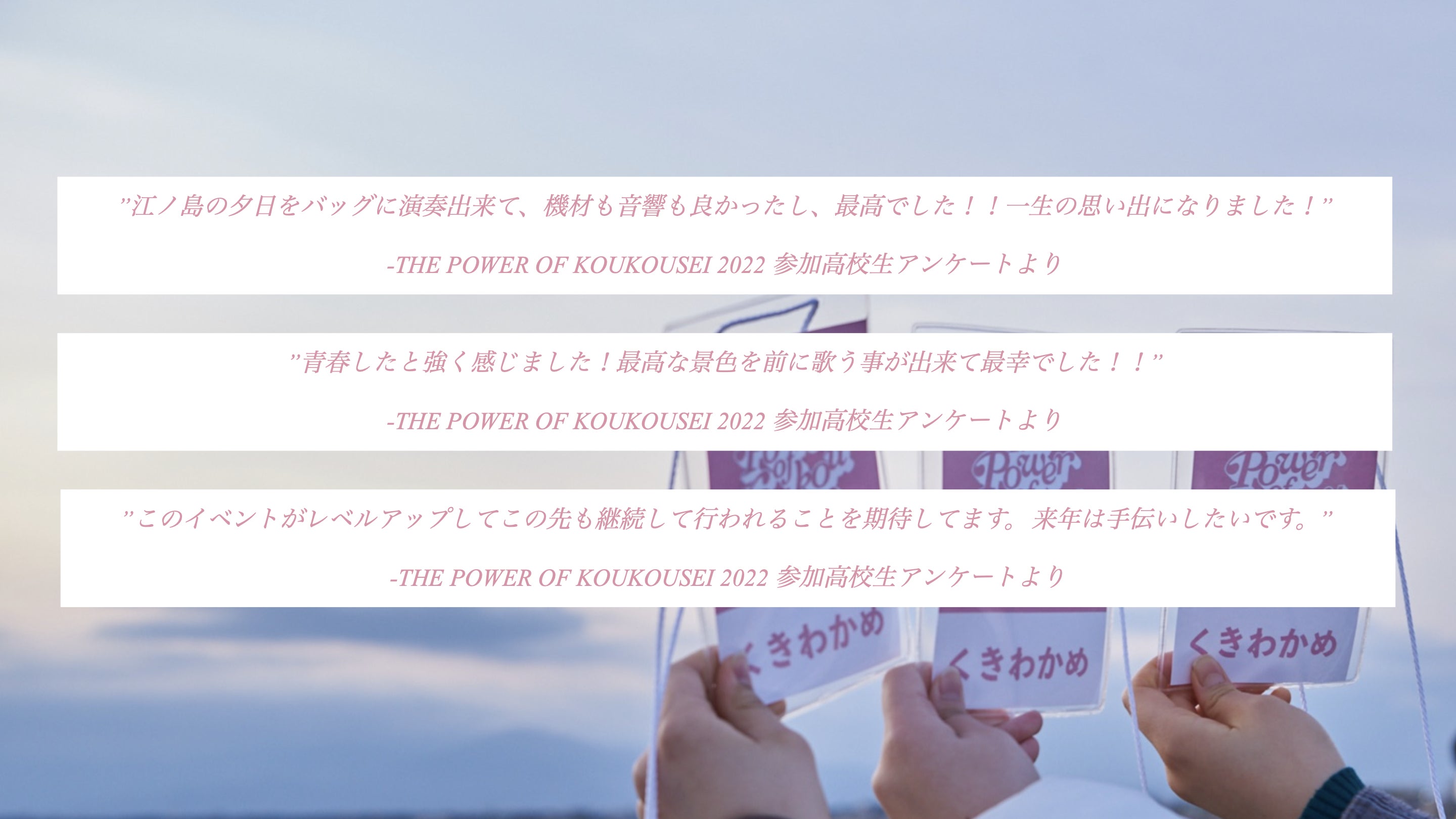 昨年コロナ禍で漏れた高校生の声をきっかけにこのイベントを初開催し、沢山の高校生のパワーをステージの上で感じることができました。真剣な眼差しと、そこから溢れ出るたくさんの笑顔が見れた最高のイベントとなりました。コロナ禍でもあれだけ彼ら彼女らは江の島で楽しむことができた。誤解を選ばずに言うと、コロナじゃなかったらあんな真剣な眼差しと笑顔が見れなかった。最悪なコロナがきっかけで生まれた最高のイベント。この街の高校生じゃなかったら、この街のステージじゃなかったらきっと生まれなかったイベント。この街の青春の力が詰まった『THE POWER OF KOUKOUSEI』を、誰もが毎年この時期になるとワクワクするような藤沢市の文化にするためにお力添えいただけたら幸いです。