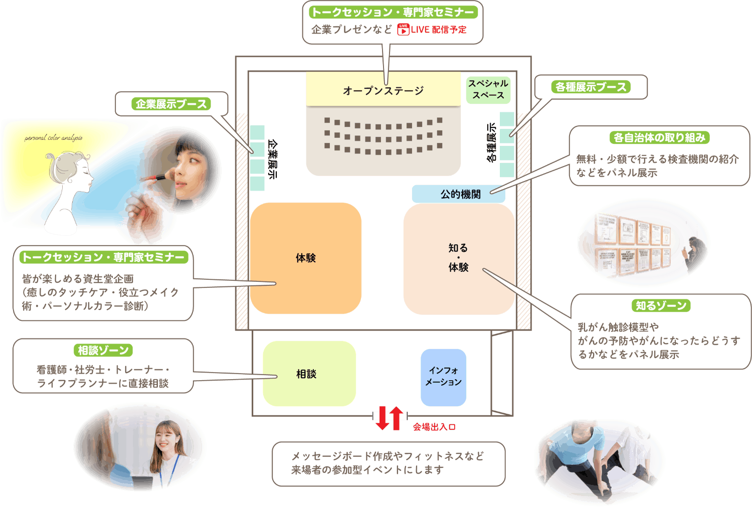 今の時代、インターネットを通じていくらでも情報を得ることができます。がんに関する情報もあふれています。ただスマホのブラウザで見るだけでは心に重要な情報が残るでしょうか。がんフェアではAYA世代の乳がんサバイバーのトークイベントを計画しています。またがん治療の真っただ中で患者様のために奮闘している先生方、看護師の方、医療機器開発者の先生の講演を計画しています。登壇者の生の声を聴き、場合によっては質問をしていただいてがん医療に対するリアルなイメージを持っていただきたいと考えています。また、社会保険労務士の先生、企業の労務担当の方など、医療以外でがん患者様を支える方々にもお話を伺う計画です。その他アピアランスケア、フィットネス、謎解きゲームなどのコンテンツも揃えたい。それにより、今までにない、体験型の社会イベントが実現できます。がんフェアを通じて得られた体験は、皆様の心に残り、がん検診率、ワクチン接種率の向上、がん患者様、サバイバーの皆様への理解につながることを目指しています。