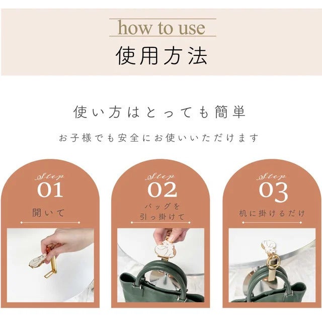1.開いて 2.カバンを引っ掛けて 3.机に掛けるだけ