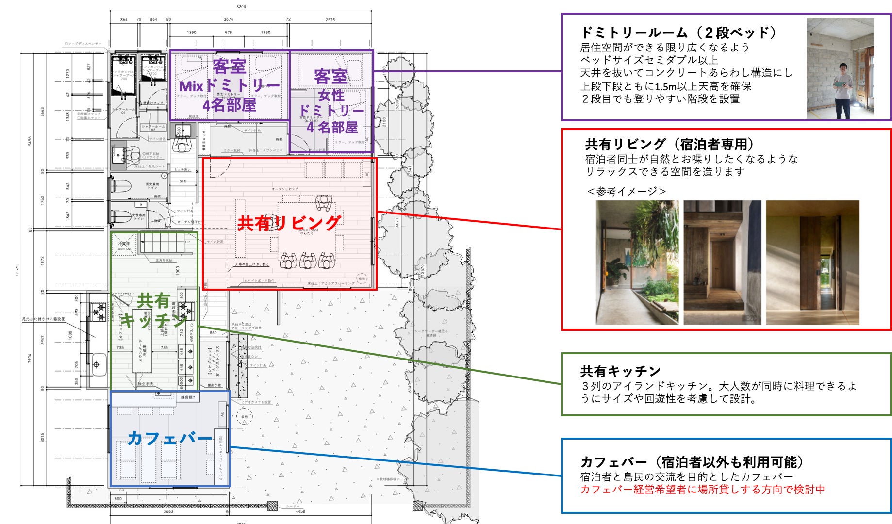 そんな島民の方々と旅行で来る方々が一緒に時間を共有できるカフェバーを宿泊施設に併設させようと考えています。そこで生まれる出会いを通じて、島民の方の文化やスキルを継承して移住するような人が出てきたり、新しい事業が生まれたり、地方創生のきっかけになるような場になれたら大変嬉しく思います。