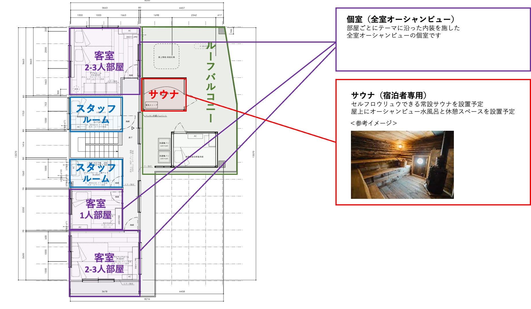 またゲストハウスが汚いというイメージも払拭できるよう、清潔感があり居心地の良い空間創りを建築家の四ツ谷氏と一緒に励んでいます。またドミトリー(相部屋)だけでなく、プライベートもしっかり確保できる個室(全室オーシャンビュー)もご用意する予定です。