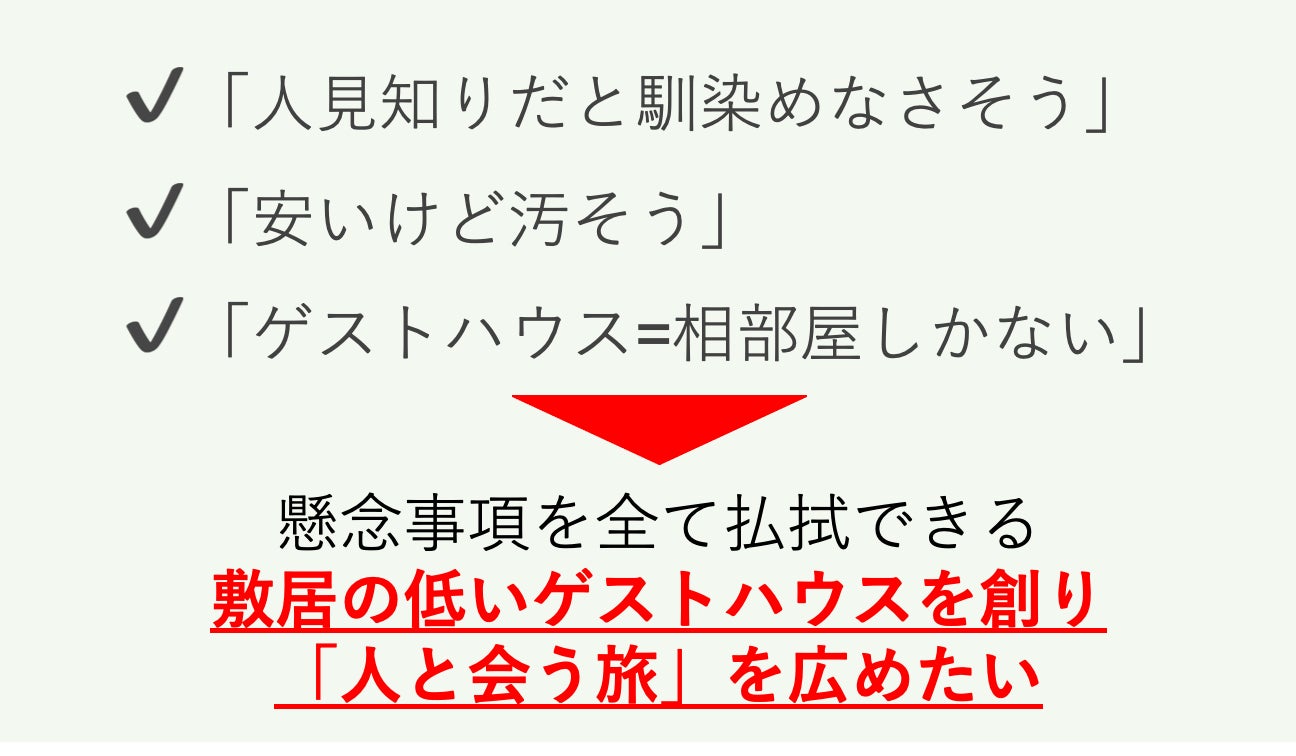 色々マイナスイメージがあると思います。それらを全て払拭して敷居の低いゲストハウスを創ります。
