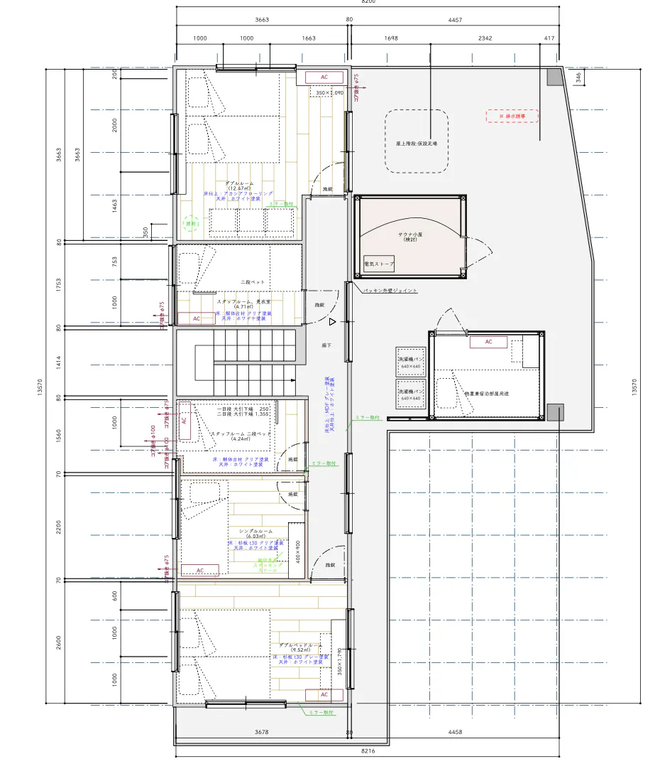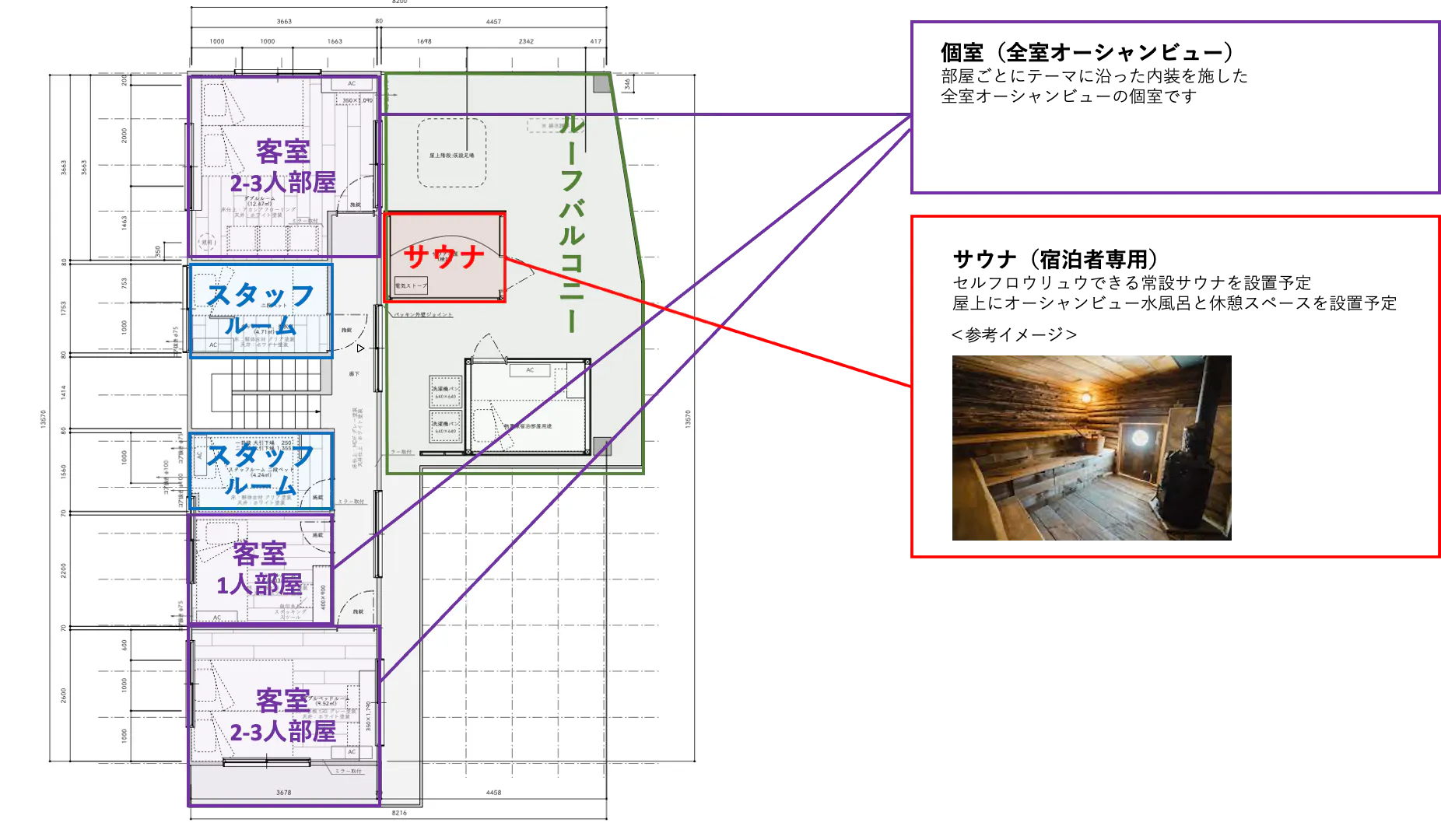 サウナストーブもセルフロウリュウができるタイプのものを用意し、水風呂も屋上に設置します。