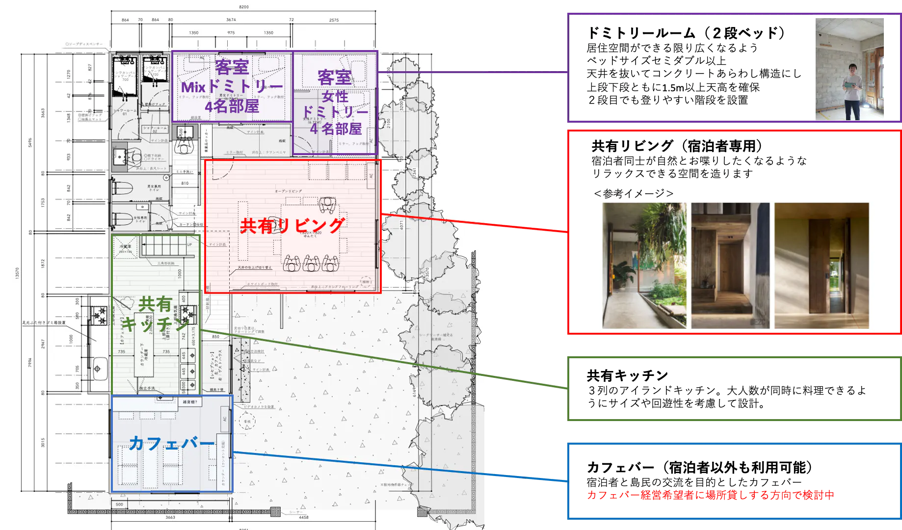 またゲストハウスが汚いというイメージも払拭できるよう、清潔感があり居心地の良い空間創りを建築家の四ツ谷氏と一緒に励んでいます。またドミトリー(相部屋)だけでなく、プライベートもしっかり確保できる個室(全室オーシャンビュー)もご用意する予定です。