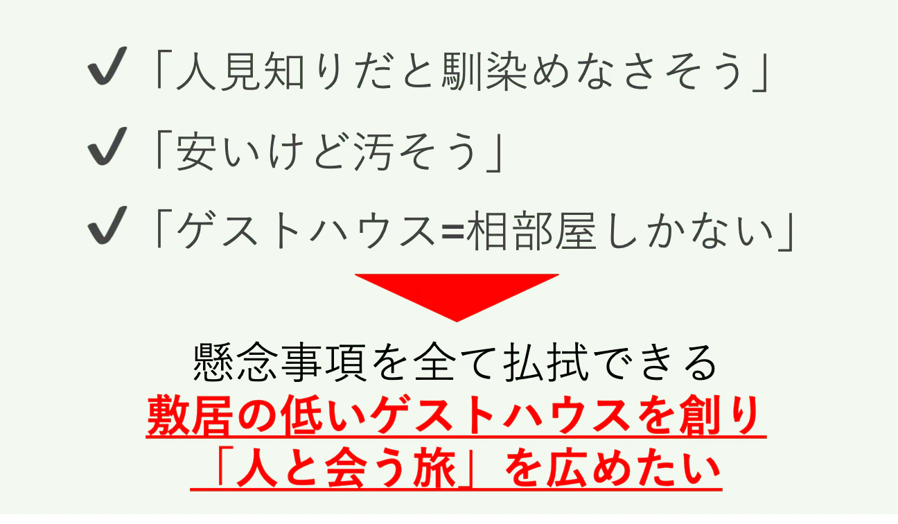 色々マイナスイメージがあると思います。それらを全て払拭して敷居の低いゲストハウスを創ります。