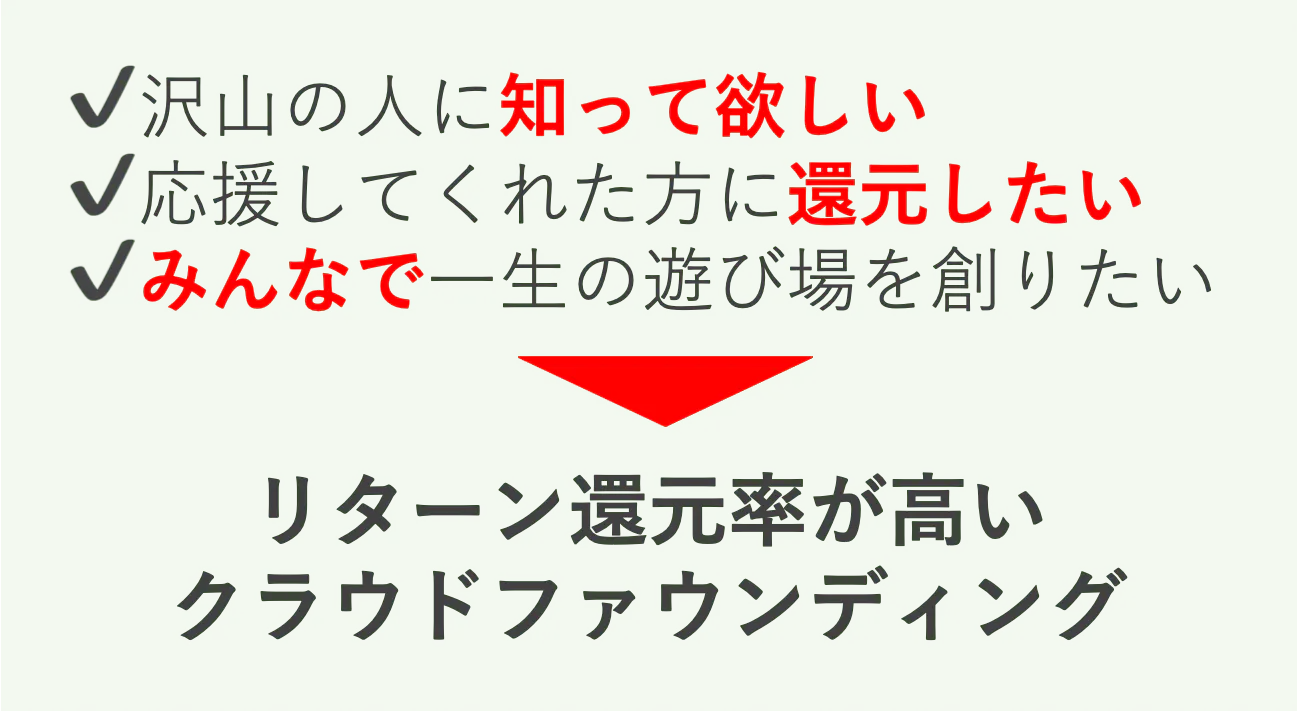 そんな中で単純に比較サイトに載せて告知することも考えたのですが、私達の想いに共感してくれた人に来て欲しいという気持ちがあり、告知の手段としてクラウンドファウンディングを実施することにしました。