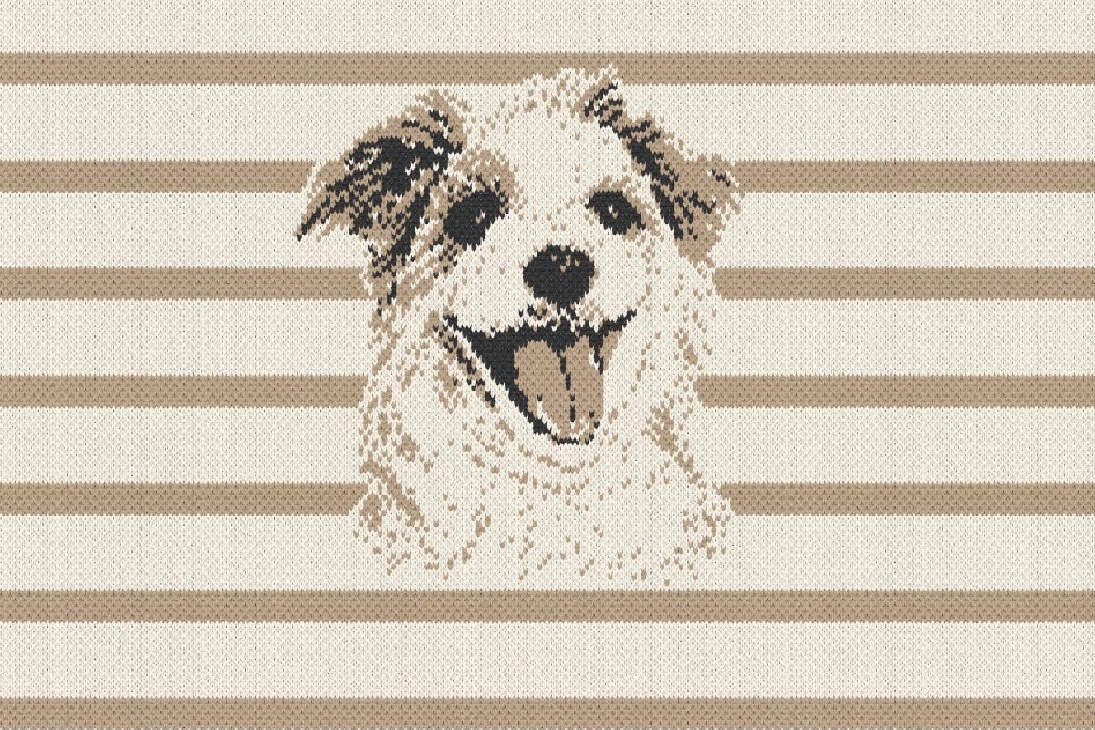 ペットの写真をアップロードすると、その写真をもとに編み物の図案を作成し、工業用自動横編み機で生地を編み上げ、小さな町工場でオーダーメイドのニット雑貨を作成します。